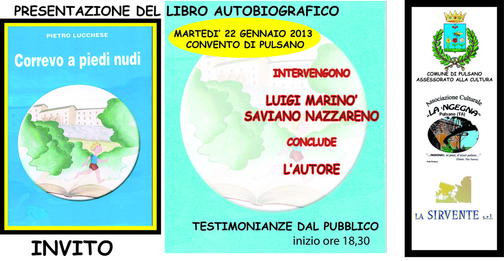 Martedì 22 gennaio alle ore 18,30 nella sala ex refettorio del Convento dei PP. RR. a Pulsano sarà presentato il volume “Correvo a piedi nudi” del Prof. Pietro Lucchese. Si tratta di un’autobiografia che narra, in uno stile piano e accattivante, le vicende esistenziali di un ragazzo “di strada” di umili origini contadine, che, attraverso le varie fasi della vita, con l’aiuto un po’ della fortuna e un po’ della provvidenza, ma soprattutto con l’impegno e la tenacia che gli sono propri, è divenuto l’uomo di cultura che in tanti conoscono.