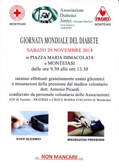 Sabato 29 novembre p.v. dalle ore 9:00 alle 13:30 il Dott. Antonio Picardi coadiuvato dai volontari dell’Associazione A.D.J. di Taranto e della Fratres e Croce Rossa di Monteiasi sarà in P.zza M. Immacolata a Monteiasi per effettuare gratuitamente esami glicemici e misurazioni della pressione arteriosa. Il tutto nell’ottica che “prevenire è meglio che curare”.