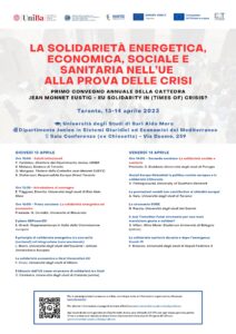 Nelle giornate di giovedì 13 aprile, dalle ore 15:00, e di venerdì 14 aprile, dalle ore 10:00, presso la Sala Conferenze (ex Chiesetta) del Dipartimento Jonico dell’Università di Bari in via Duomo n. 259, Taranto, si terrà il primo Convegno annuale della Cattedra Jean Monnet “EUSTiC”, dal titolo La solidarietà energetica, economica, sociale e sanitaria nell’UE alla prova delle crisi co-organizzato dal Centro EUROPE DIRECT Taranto e dalla Cattedra Jean Monnet “EUSTiC – EU Solidarity in (Times of) Crisis?”, un progetto finanziato dalla Commissione europea attraverso il Programma ERASMUS+.