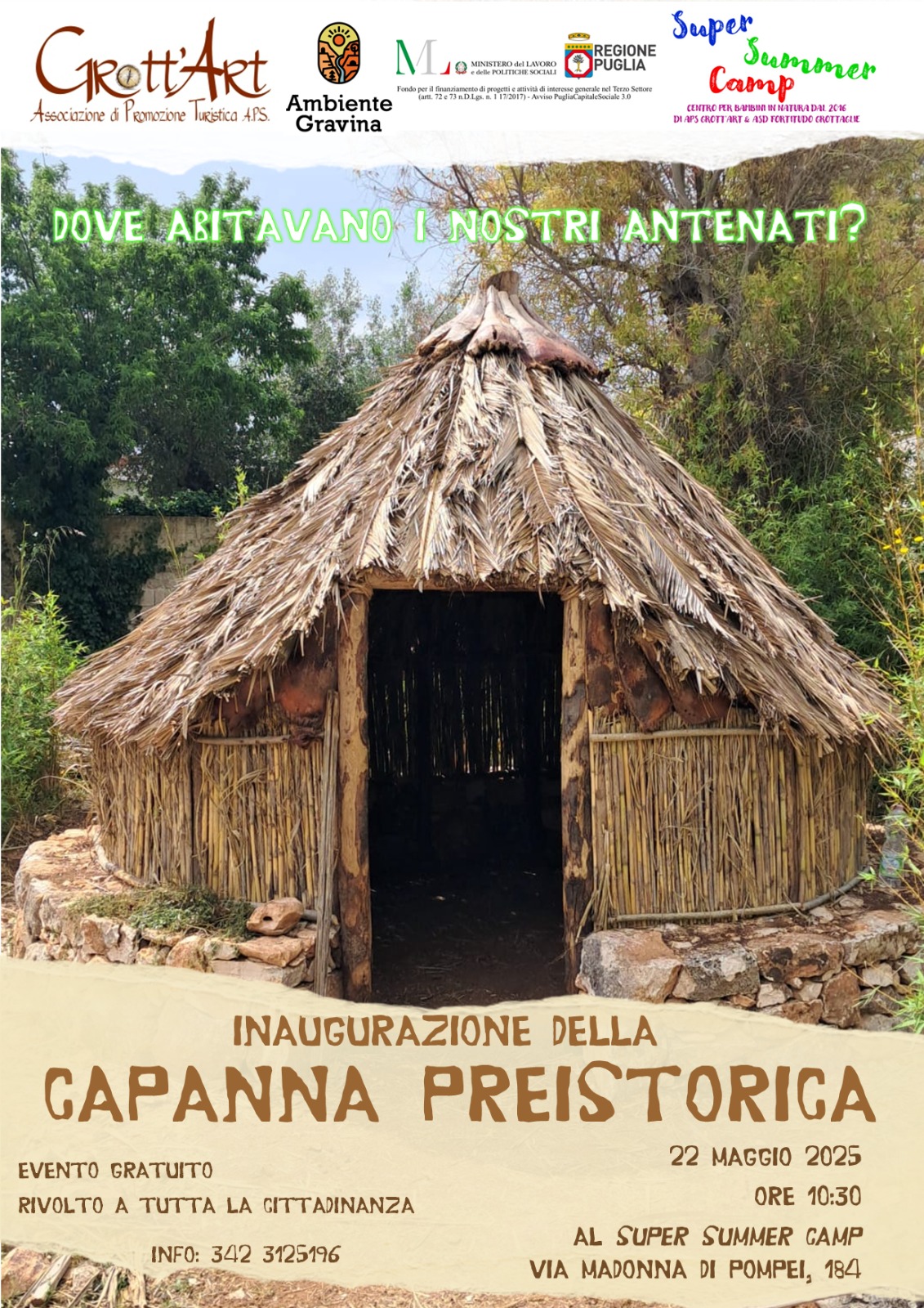 Una capanna preistorica sarà inaugurata a Grottaglie, presso il Super Summer Camp in via Madonna di Pompei n.184, alle ore 10.30 di giovedì 22 maggio, nel corso di una pubblica cerimonia aperta alla cittadinanza e a cui parteciperanno i rappresentanti della locale Amministrazione comunale e del mondo della scuola e dell’associazionismo del territorio.