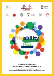 Sarà presentato venerdì 24 novembre alle 18:00 presso il Teatro comunale “N. Resta” di Massafra, Disability Pro, il progetto proposto dall’Associazione Il Ponte APS ETS finanziato dalla Regione Puglia con risorse statali del Ministero del Lavoro e delle Politiche Sociali nell’ambito dell’Avviso Puglia Capitale Sociale 3.0