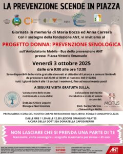 In occasione della Giornata in memoria di Maria Bozza ed Anna Carrera con il sostegno della Fondazione ANT, venerdì 3 ottobre in P.zza Vittorio Emanuele a Laterza dalle 9:00 alle 13:00 si potranno effettuare visite senologiche gratuite nell’Ambulatorio mobile – Bus della prevenzione ANT.