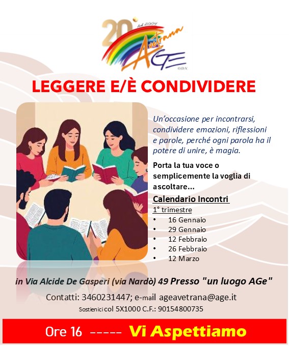 Partirà venerdì 16 gennaio il progetto dell’Associazione Genitori di Avetrana – ODV dal titolo Leggere e/è condividere: una proposta di incontri di lettura e socializzazione per chi ama i libri e crede nel loro valore etico-formativo.