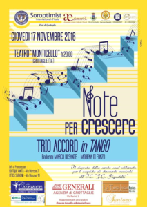 Protagonista del concerto Edizione 2016, che si terrà giovedì 17 novembre alle 20:00 presso il Teatro Monticello di Grttaglie, sarà il TRIO ACCORD, composto da Gennaro Minichello Violino, Giovanna D’amato – Violoncello e Pasquale Coviello – Fisarmonica, musicisti professionisti laureati nei conservatori italiani e specializzati, ciascuno per il proprio strumento, con maestri di fama internazionale. Vincitori di concorsi da solisti e in formazioni da camera, affiancano ad una ricchissima attività concertistica in Italia e all’Estero, attività didattica presso i Conservatori di Stato e Licei Musicali . Il trio, consolidato da diversi anni, si è esibito nelle più importanti sale concertistiche di tutto il mondo, riscuotendo sempre significativi apprezzamenti per la solidità tecnica, la grande musicalità ed un affiatamento d’insieme percettibile al primo ascolto.