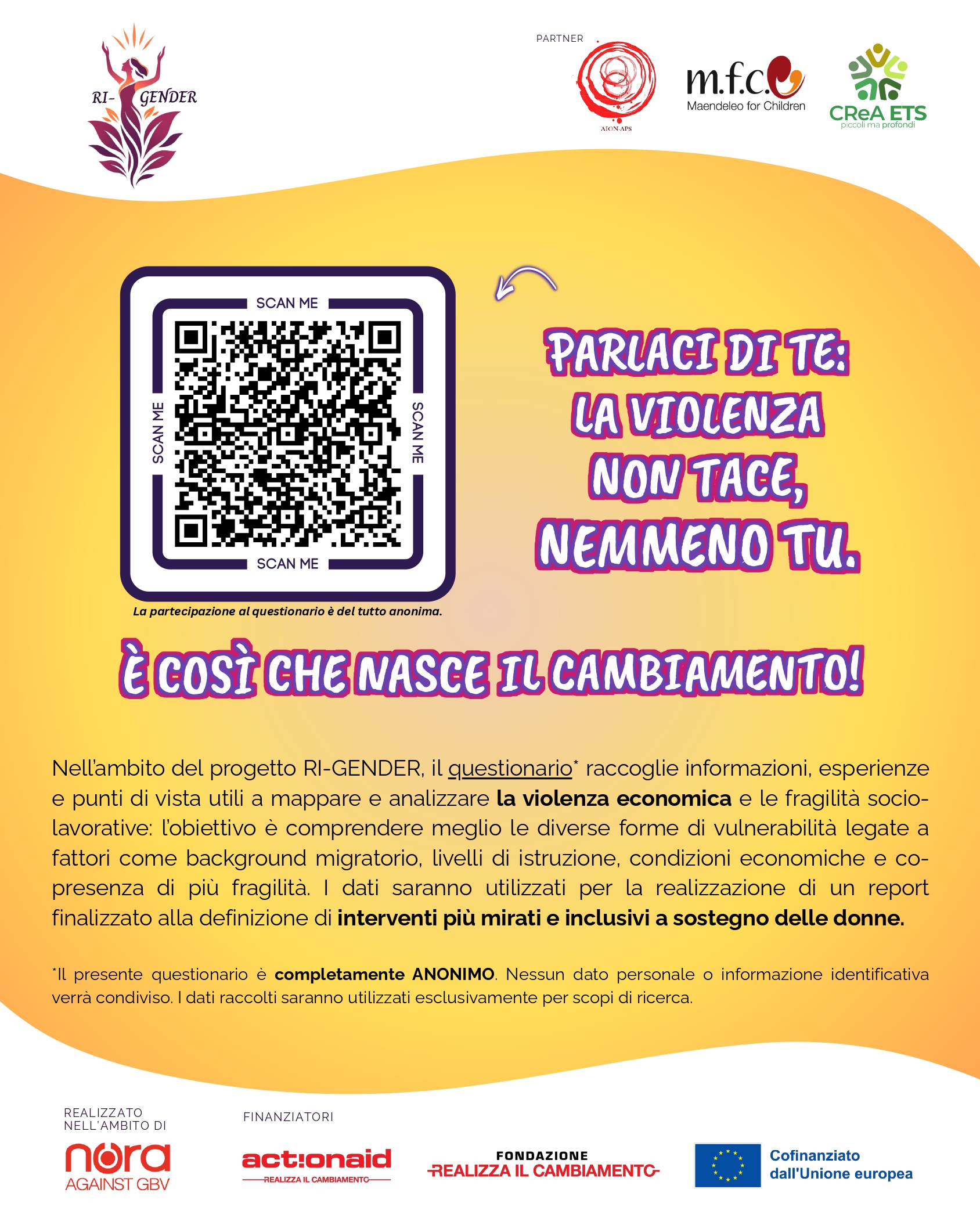 Nell’ambito del progetto, ha avuto inizio la diffusione del questionario sulla violenza economica che ha l’obiettivo di raccogliere informazioni, esperienze e punti di vista utili a mappare e analizzare questo tipo di violenza e le fragilità socio-lavorative: lo scopo è comprendere meglio le diverse forme di vulnerabilità legate a fattori come background migratorio, livelli di istruzione, condizioni economiche e co-presenza di più fragilità. I dati saranno utilizzati per la realizzazione di un report finalizzato alla definizione di interventi più mirati e inclusivi a sostegno delle donne.