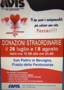 Vista la carenza di sangue che si accentua notevolmente nei mesi estivi, l’Avis di Manduria ha organizzato per martedi 26 luglio, dalle ore 17:00 alle ore 21:00, la prima raccolta straordinaria di sangue.