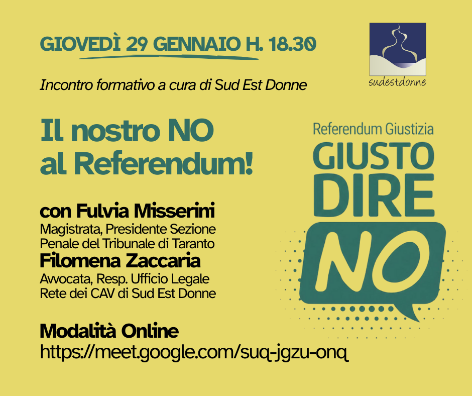 Proprio per la rilevanza e la complessità delle questioni poste dal referendum, Sud Est Donne ha deciso di organizzare per giovedì 29 gennaio alle ore 18:30, un incontro formativo online, di approfondimento e di confronto, aperto alla cittadinanza e alle realtà del territorio dal titolo “Il nostro NO al Referendum”