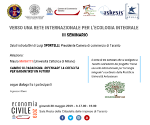 Prosegue il percorso di approfondimento sull’Ecologia Integrale con i seminari del Progetto Verso una Rete internazionale dell’ecologia integrale, intrapreso dalla Pontificia Università Antonianum, insieme a Camera di commercio di Taranto, Centro di cultura per lo sviluppo “G. Lazzati” – Università Cattolica Taranto, GPIC Frati Minori d’Italia, Askesis e Consorzio Costellazione Apulia.