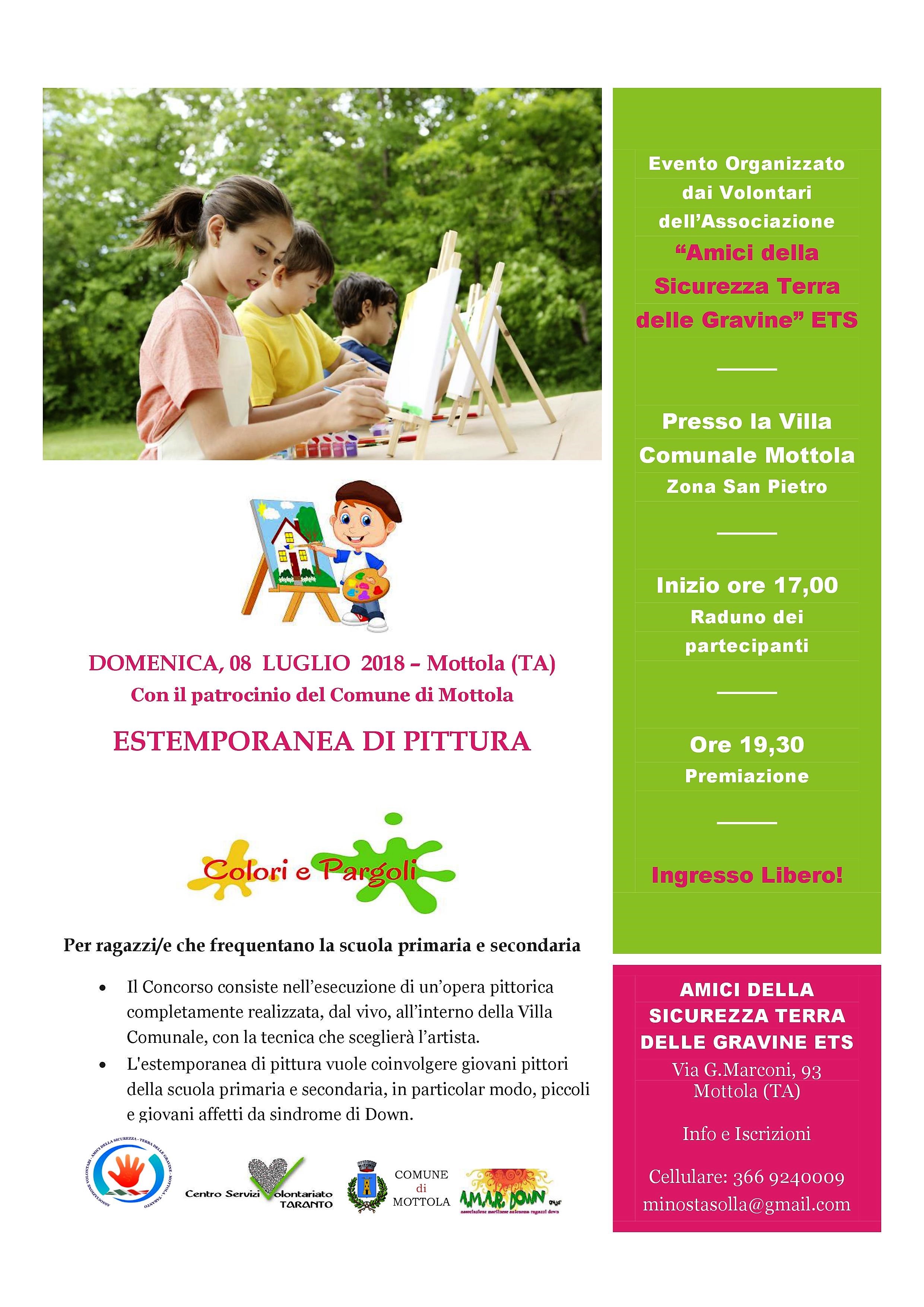 Colori e pargoli, il concorso di pittura estemporanea organizzato dall’Associazione Amici della sicurezza Terra delle Gravine previsto per il prossimo 23 giugno, è stato rinviato a domenica 8 luglio p.v.