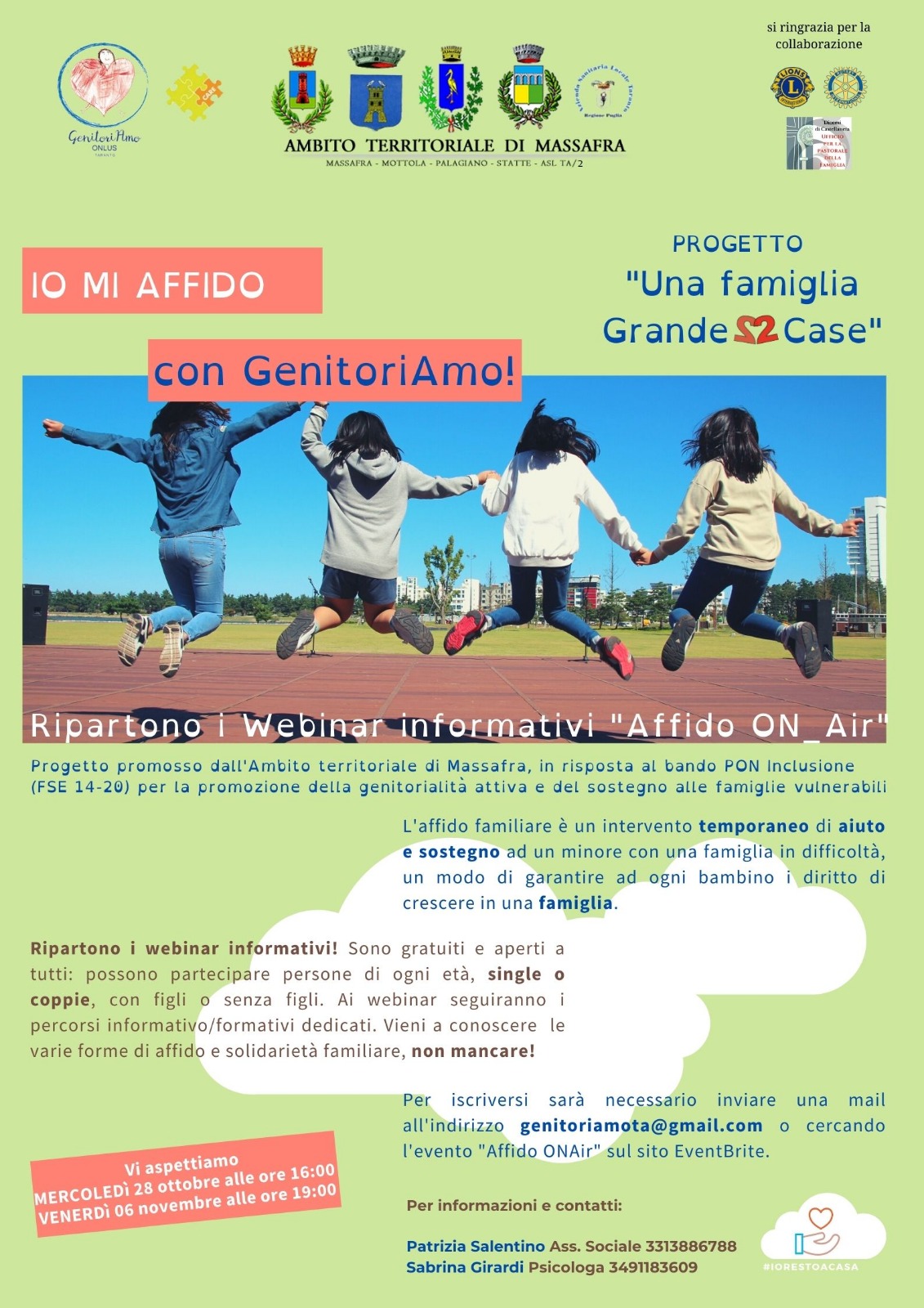 Mercoledì 28 ottobre h 16:00 e venerdì 6 novembre h 19:00 ripartono i webinar informativi del Progetto una Famiglia Grande 2 Case! Sono singoli incontri informativi per conoscere l’accoglienza, l’affido e la solidarietà familiare. Si può scegliere la data preferita e iscriversi con email a genitoriamota@gmail.com o su EVENTBRITE o telefonando