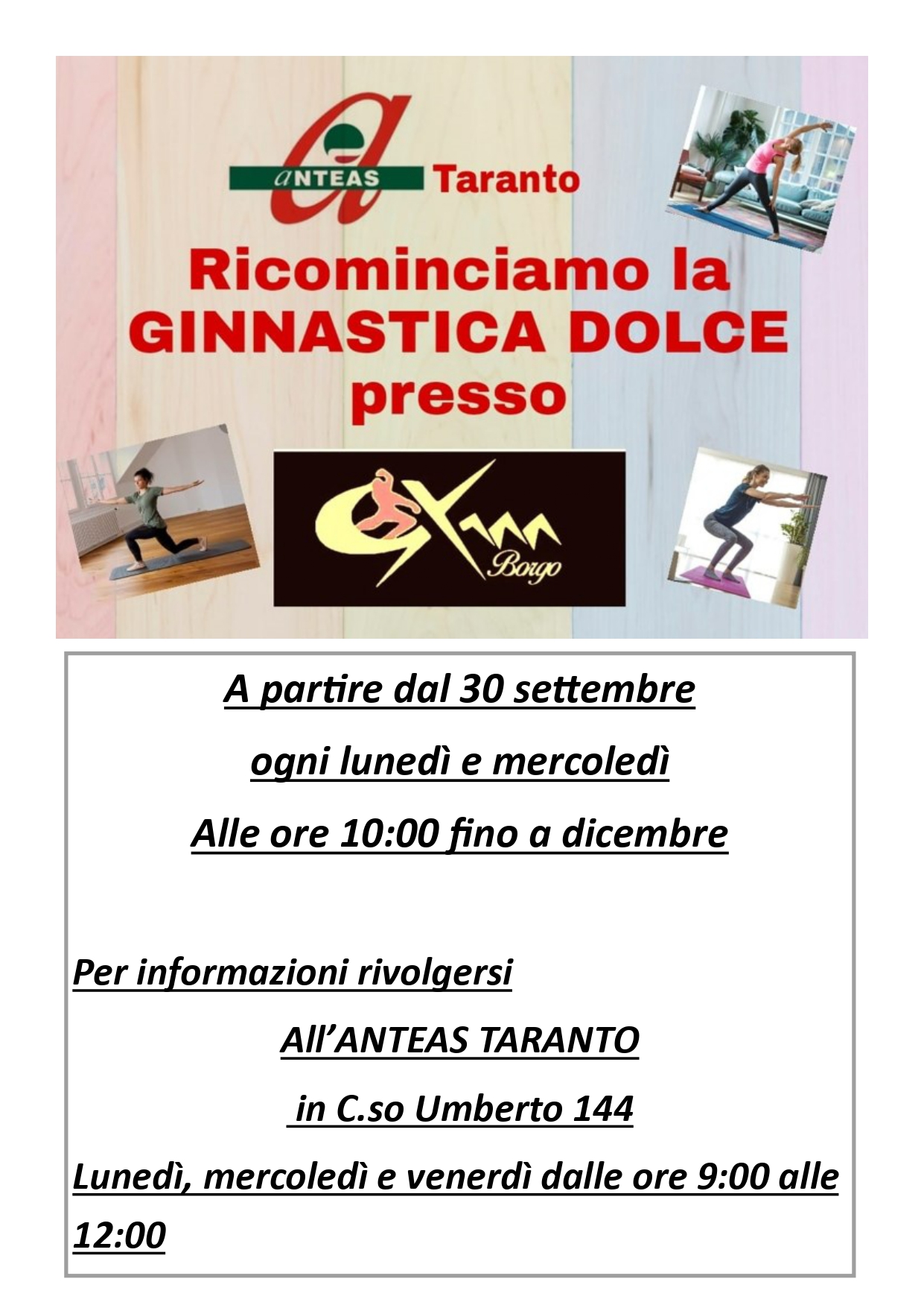 Riprenderanno a partire dal 30 settembre prossimo le lezioni di Ginnastica dolce per gli anziani, residenti nel borgo, organizzate da A.N.T.E.A.S. – Associazione nazionale tutte le età attive per la solidarietà Taranto APS