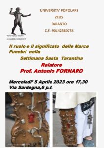 In occasione della Settimana Santa, mercoledì 5 aprile alle ore 17,30 presso la sede dell’Associazione ZEUS che organizza l’iniziativa, in Via Sardegna n.6, il Prof. Antonio Fornaro, cultore della tarantinità, relazionerà sul tema Ruolo e significato delle marce funebri nella Settimana Santa tarantina.