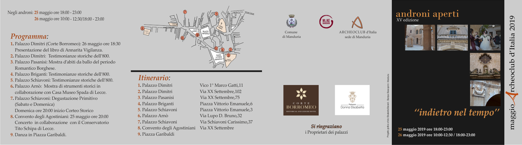 Si avvia alla chiusura il “Maggio Archeoclub 2019 organizzato dalla sede manduriana dell’Archeoclub d’Italia. Come da tradizione, l’ultimo fine settimana del mese di maggio si svolgerà la manifestazione “Androni aperti”, giunta alla XVI edizione quest’anno realizzata in collaborazione con l’Associazione “Make Manduria”. L’appuntamento è quindi per sabato 25 maggio, dalle ore 18.00 alle 23.00, e per domenica 26 dalle ore 10.00 alle 12.30 e dalle ore 18.00 alle 23.00.