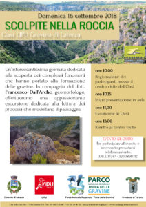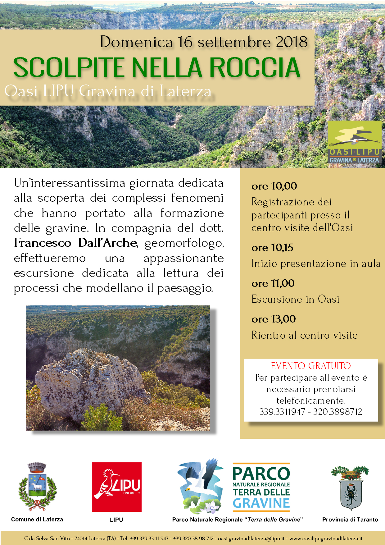 Nell’ambito del programma Eventi-Natura 2018 dell’Oasi LIPU Gravina di Laterza domenica 16 settembre, alle ore 10,00 si terrà l’evento Scolpite nella roccia. Una interessantissima giornata dedicata alla scoperta dei complessi fenomeni che hanno portato alla formazione delle gravine. In compagnia del dott. Francesco Dall’Arche, geomorfologo, l’escursione sarà dedicata alla lettura dei processi di modellamento del paesaggio.