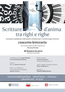 L’Associazione di Volontariato Culturale MAW/Music Art Writing communication organizza un concerto letterario dal titolo Scritture d’anima tra righi e righe che si svolgerà nella ex chiesa all’interno dell’Università degli studi Aldo Moro in Via Duomo a Taranto giovedì 5 dicembre p.v. a partire dalle ore 19.30.