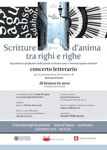 L’evento, costruito attorno a un emozionale connubio tra parole e musica, vuole presentare in maniera inusuale e altamente godibile, il romanzo di Rossana Fiorini Di bianco in neve. Patrocinato dall’Università stessa e dall’Armando Curcio Editore, con la coordinazione del prof. Cosimo D’Angela, il concerto letterario vedrà il maestro Nunzio Dello Iacovo interpretare al pianoforte i Sei Momenti Musicali op. 16 di Rachmaninov in una suggestiva integrazione alla lettura di alcune pagine scelte dall’intenso romanzo della Fiorini.