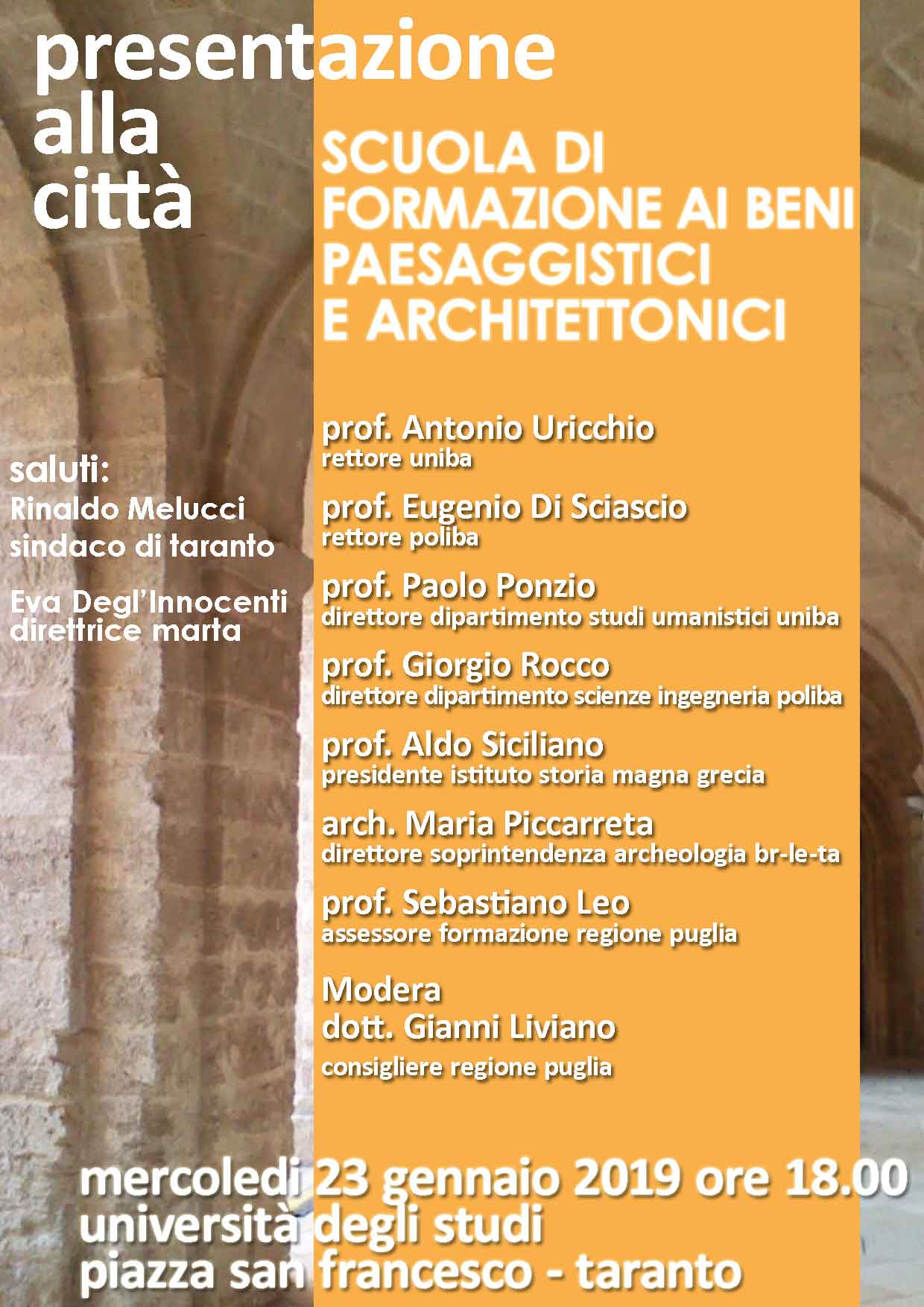 Nell’ambito del rafforzamento dell’offerta dell’alta formazione a Taranto, così come previsto dalla legge regionale n.2 del 16/01/2018 (cd. Legge Taranto), lo scorso 21 dicembre 2018 la Giunta regionale ha deliberato lo spostamento a Taranto della “Scuola di Specializzazione per i Beni Architettonici e Paesaggistici” (biennale), già attiva a Bari, quale primo passo per la realizzazione congiunta tra Politecnico di Bari e Università degli Studi di Bari della “Scuola Superiore per i Beni Archeologici, Architettonici e Paesaggistici”, quale integrazione tra la suddetta “Scuola di Specializzazione per i Beni Architettonici e Paesaggistici” del Politecnico e la “Scuola di Specializzazione in Beni Archeologici” dell’Università degli Studi di Bari.