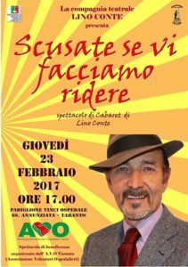Domani, 23 febbraio, alle ore 17:00 presso la sala d’attesa del Padiglione Vinci dell’Ospedale SS. Annunziata, la compagnia teatrale Lino Conte presenta l’esilarante spettacolo di cabaret Scusate se vi facciamo ridere. L’Associazione Volontari Ospedalieri – AVO di Taranto, attraverso la rappresentazione di Lino Conte e della sua Compagnia, propone “la risata come terapia del malessere e del malumore” mettendo in scena una serie di sketch, il meglio, i più divertenti del suo repertorio e ripescando le scenette più famose dei grandi comici che hanno scritto e fatto la storia del varietà e del cabaret italiano: Raimondo Vianello, Sandra Mondaini, Walter Chiari, Carlo Campanini, Rik e Gian, Proietti, Montesano e tanti altri.
