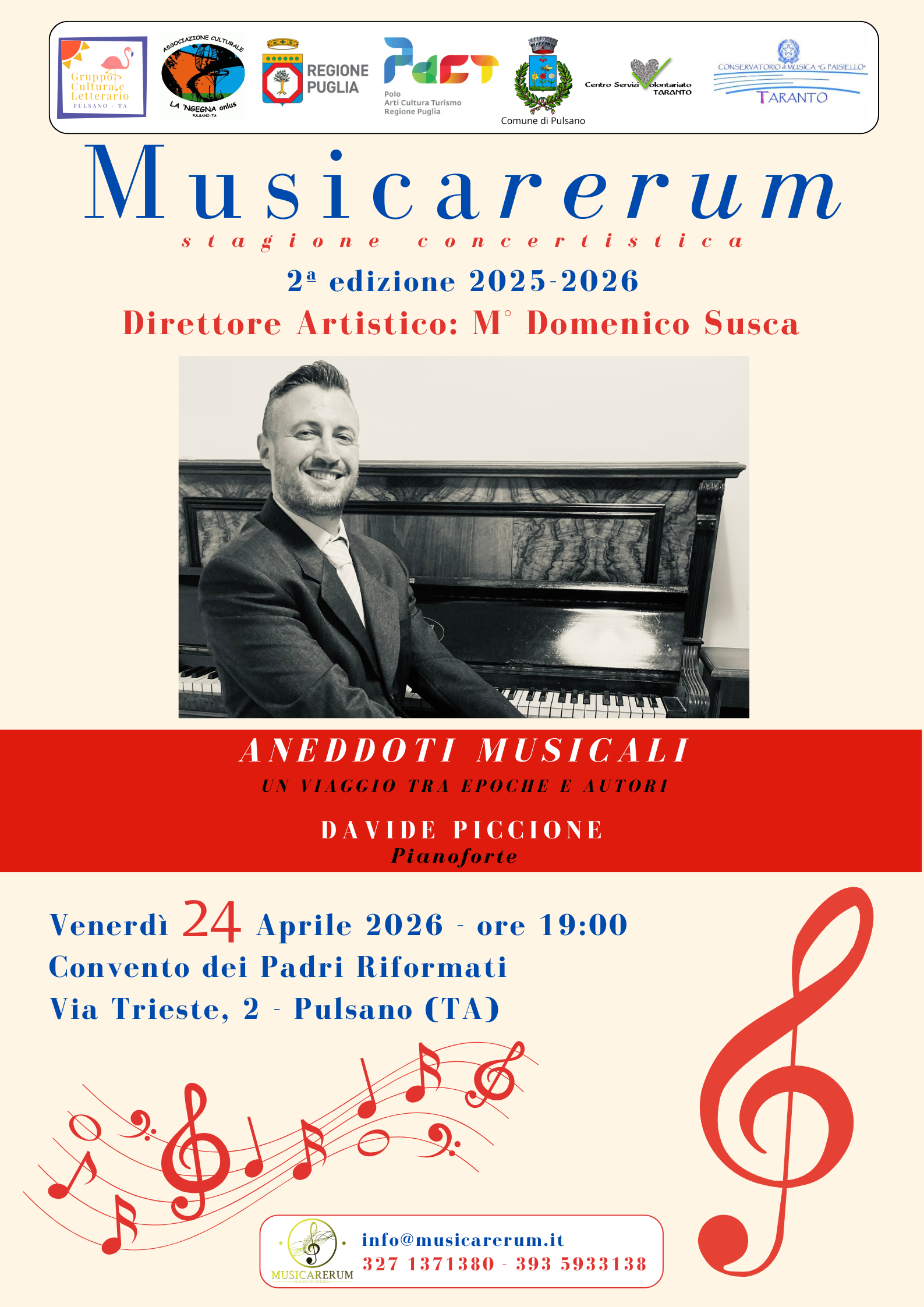 Venerdì 24 aprile alle ore 19:00 il Convento dei Padri Riformati in via Trieste, 2 a Pulsano ospiterà il concerto del pianista Davide Piccione dal titolo Aneddoti Musicali – Un viaggio tra epoche e autori.