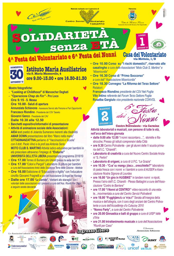 Con la Manifestazione Solidarietà Senza Età: quarta edizione Festa del Volontariato e sesta edizione Festa dei Nonni, si conferma e rafforza il sodalizio dei partner dell’iniziativa: il CAV – Coordinamento Associazioni di Volontariato di Martina Franca, il CSV – Centro Servizi Volontariato – di Taranto e l’ Assessorato alle Politiche Sociali e Servizi alla Persona del Comune di Martina Franca, che dallo scorso anno ha contribuito ad arricchire i contenuti della manifestazione spostando anche l’attenzione a una risorsa fondamentale delle nostre comunità, gli anziani, celebrati con la Festa dei Nonni.