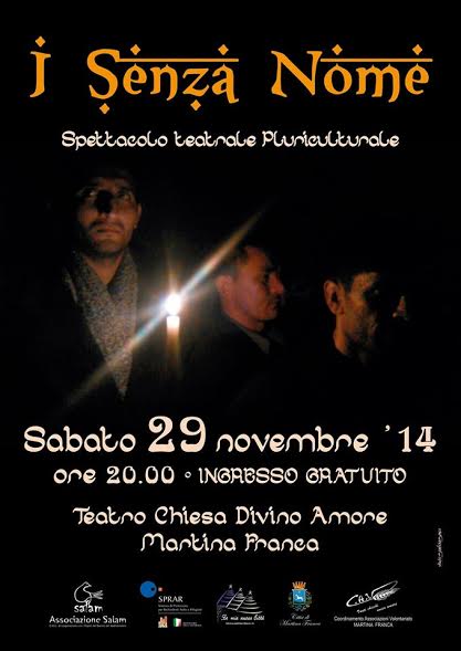 Si chiama I Senza Nome lo spettacolo teatrale organizzato dall’Associazione SALAM con il Coordinamento delle Associazioni di Volontariato (CAV) di Martina Franca che andrà in scena sabato 29 novembre p.v. alle ore 20:00 presso il Teatro della Chiesa Divino Amore di Martina Franca.