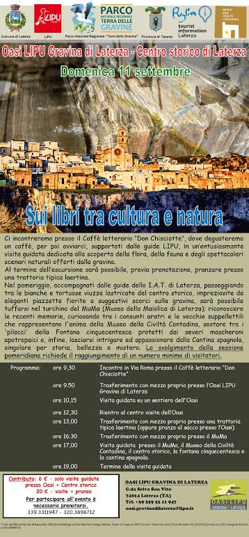 Nell’ambito del programma Eventi-Natura 2016 dell’Oasi LIPU Gravina di Laterza – realizzato grazie al contributo della Provincia di Taranto e del Comune di Laterza – domenica 11 settembre, alle ore 09.30, si terrà l’evento Sui libri tra cultura e natura.