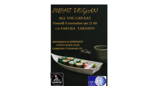 Venerdì 9 novembre alle 21:00 presso il ristorante giapponese SAKURA in Lungomare Vittorio Emanuele III, 29 a Taranto, l’Associazione OIPA organizza una degustazione a base di sushi 100% vegan.
