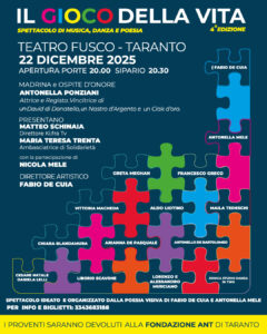 La città di Taranto si prepara ad accogliere la quarta edizione de “Il Gioco della Vita”, lo spettacolo di beneficenza ideato e organizzato da Poesia Visiva di Fabio De Cuia e Antonella Mele a favore della Fondazione ANT di Taranto.