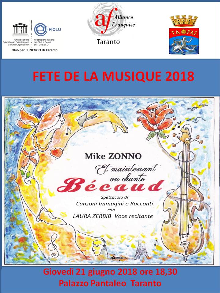 L’Alliance Française di Taranto, il Comune di Taranto e il Club per l’UNESCO di Taranto hanno organizzato per oggi pomeriggio, giovedì 21 giugno, alle ore 18.30 a Palazzo Pantaleo in Città Vecchia, Et maintenant, on chante Bécaud, uno spettacolo di canzoni, immagini e racconti, con la partecipazione di Mike Zonno e di Laura Zerbib, voce narrante.