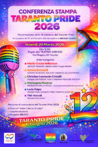Venerdì 20 marzo alle ore 9.50 nel foyer del Teatro Orfeo in Via Pitagora 80 a Taranto, è in programma la conferenza stampa di presentazione della IX edizione del Taranto Pride, prevista per sabato 6 giugno