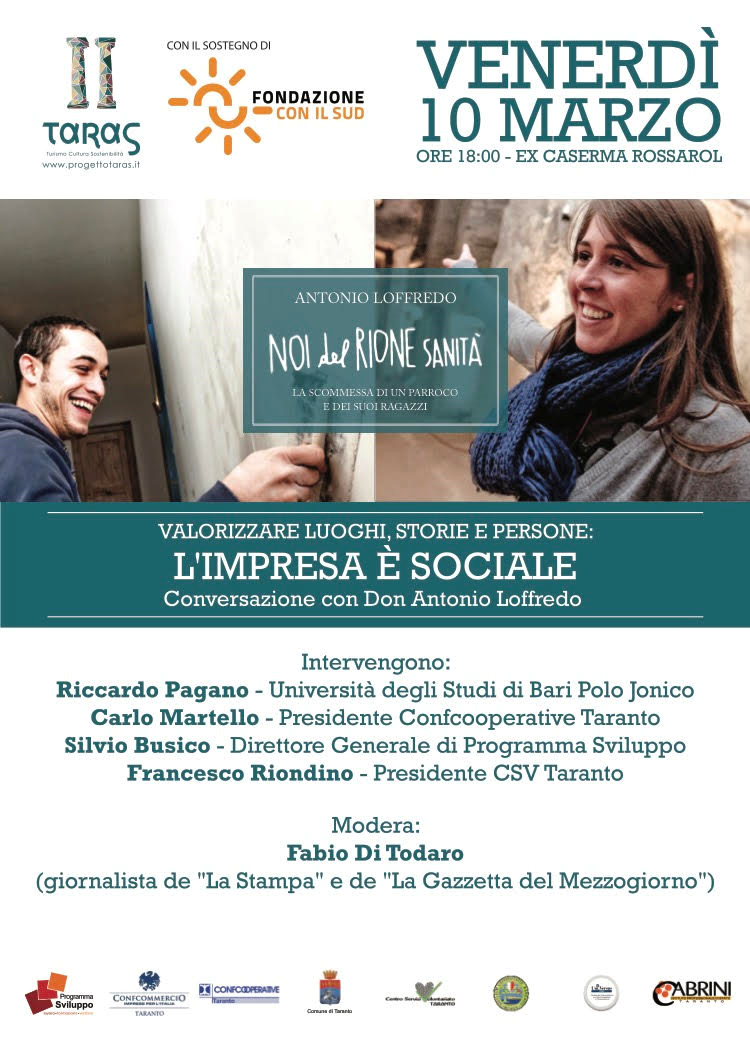 Ancora una storia virtuosa di valorizzazione del territorio, ancora un emblematico case history per riflettere su opportunità, impresa, rilancio territoriale. Dopo Paolo Rumiz, sale in cattedra, per gli eventi pubblici collegati al progetto Taras, finanziato da Fondazione con il Sud nell’ambito del bando Ambiente è Sviluppo: don Antonio Loffredo.