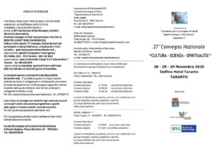L’appuntamento sul tema Cultura, scienza e spiritualità si rinnova anno dopo anno e ha raggiunto una longevità superata solo dal Convegno nazionale di studi sulla Magna Grecia. La sessione di quest’anno si svolgerà a partire da venerdì 28 novembre nelle sale dell’hotel “Mercure Delfino”, con il patrocinio del Comune di Taranto, della banca BCC di San Marzano e del CSV Taranto ETS.
