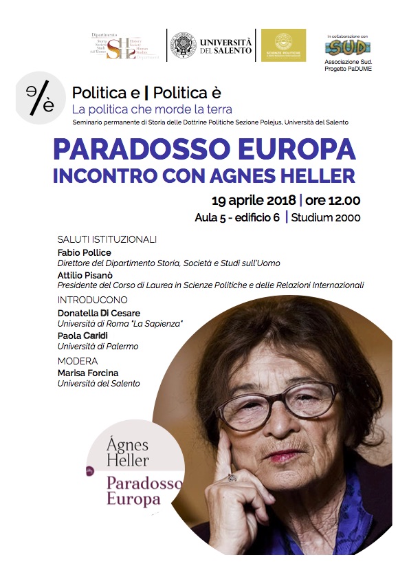 Il programma d’incontri prevede un prologo a Lecce per la mattina di giovedì 19 aprile, ore 12:00, presso l’Università del Salento (Studium 2000, Aula 5, Edificio 6 – via di Valesio), nell’ambito del Seminario permanente “Politica e / Politica è”, promosso dal Corso di Laurea in Scienze Politiche e Relazioni Internazionali. Interverranno sul tema “Paradosso Europa”, Ágnes Heller, Donatella Di Cesare e Paola Caridi. A cura delle docenti dell’Università salentina: Marisa Forcina e Elena Laurenzi