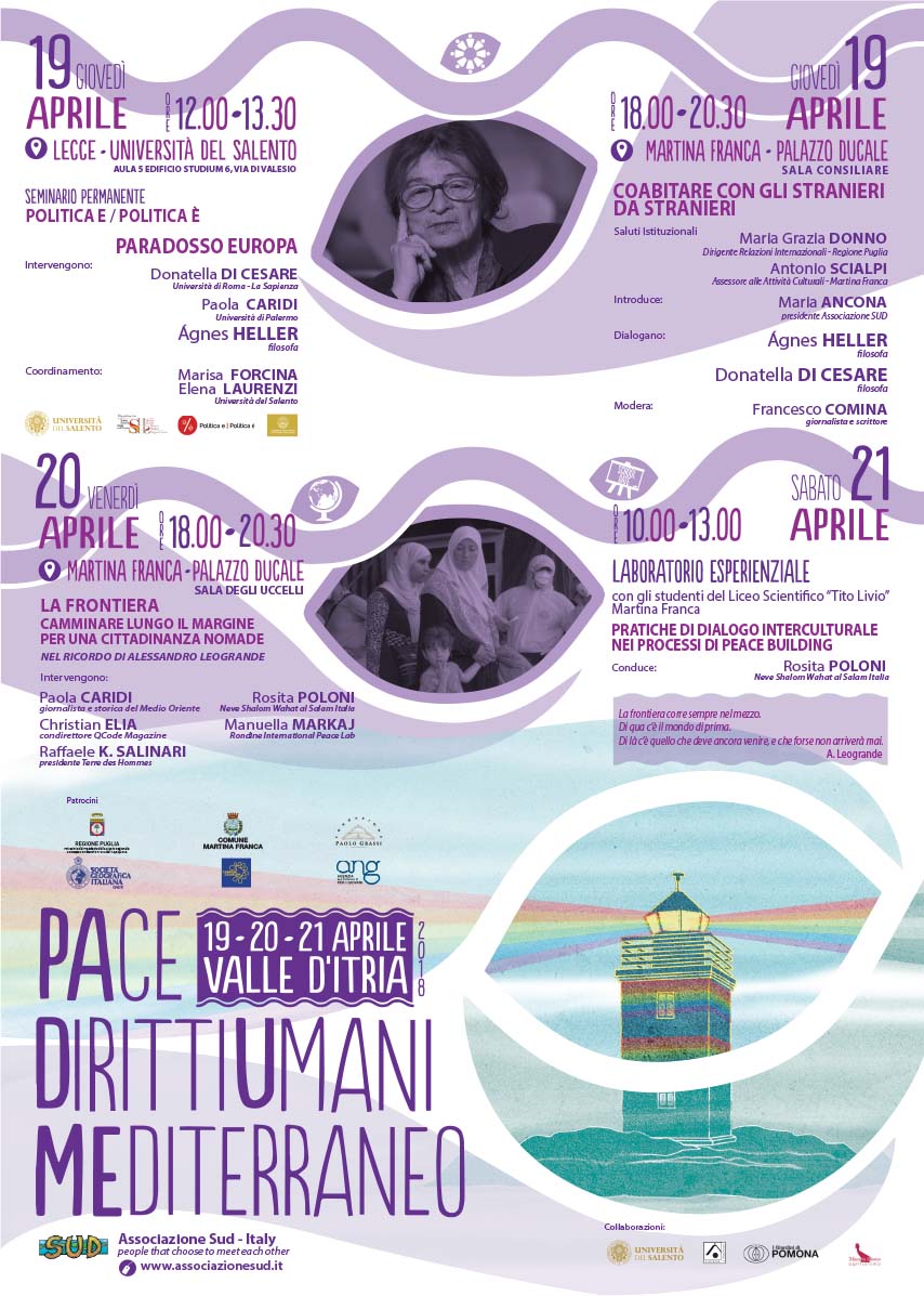 - Giovedì 19 aprile, presso la Sala Consiliare del Palazzo Ducale di Martina Franca, a partire dalle ore 18:00, Ágnes HELLER dialogherà con Donatella DI CESARE,filosofa teoretica presso l’Università di Roma “La Sapienza” e la Scuola Normale Superiore di Pisa, autrice di numerose pubblicazioni, sul tema: Coabitare con stranieri da stranieri.