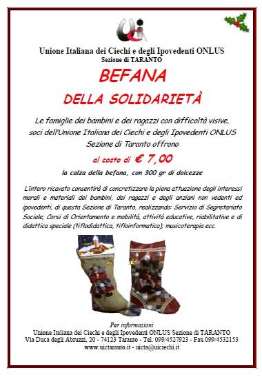 L’Unione Italiana dei Ciechi e degli Ipovedenti – UICI ONLUS Sezione Territoriale di Taranto mira a concretizzare la piena attuazione degli interessi morali e materiali dei bambini, dei ragazzi e degli anziani non vedenti ed ipovedenti, pertanto anche quest’anno l’associazione ha scelto di utilizzare la vendita delle calze della befana come forma di autofinanziamento per la realizzazione e il potenziamento delle principali attività rivolte ai soci come il servizio di segretariato sociale, corsi di orientamento e mobilità, attività educative, riabilitative e di didattica speciale (tiflodidattica, tifloinformatica), musicoterapia ecc.