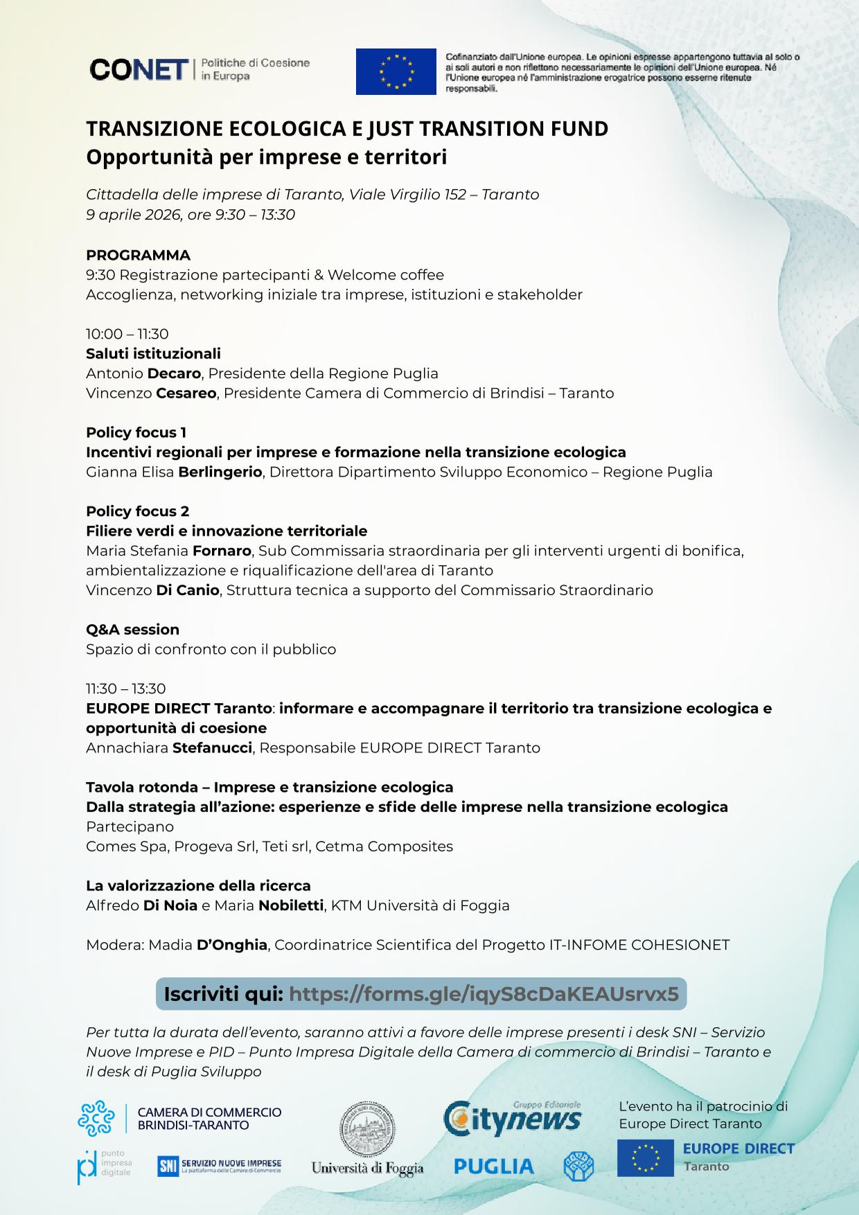 Il prossimo 9 aprile 2026, nella Sala Resta della Cittadella delle imprese di Taranto, dalle 9.30 alle 13.30, si svolgerà il convegno “Transizione ecologica e Just Transition Fund – Opportunità per imprese e territori”.