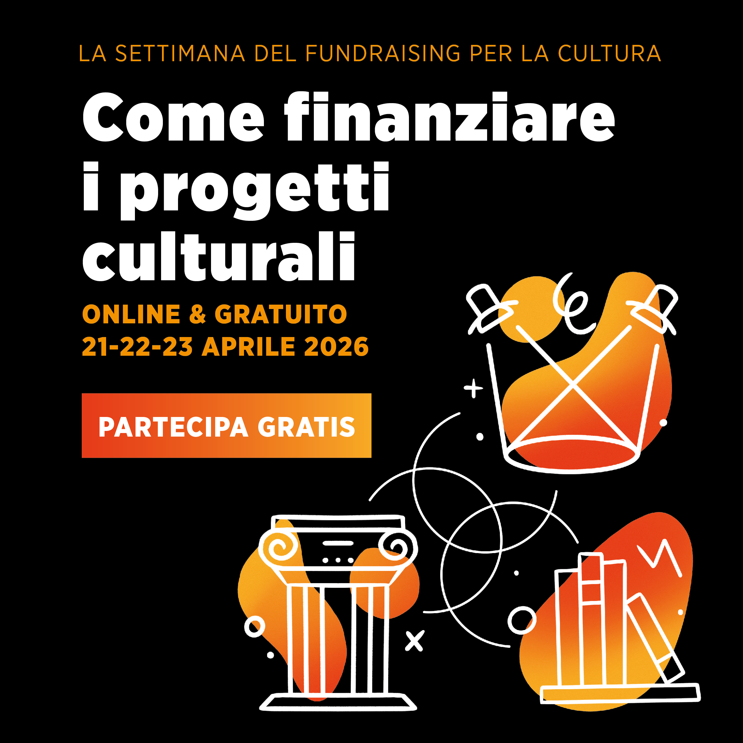 La Settimana del Fundraising per la Cultura nasce per offrire strumenti concreti per fare fundraising in modo efficace, permettendo a queste realtà di continuare a promuovere l’arte e la cultura in tutti i suoi settori. Attraverso casi di successo, esempi reali e strumenti operativi, i partecipanti capiranno come trasformare i propri progetti culturali in iniziative sostenibili nel tempo.