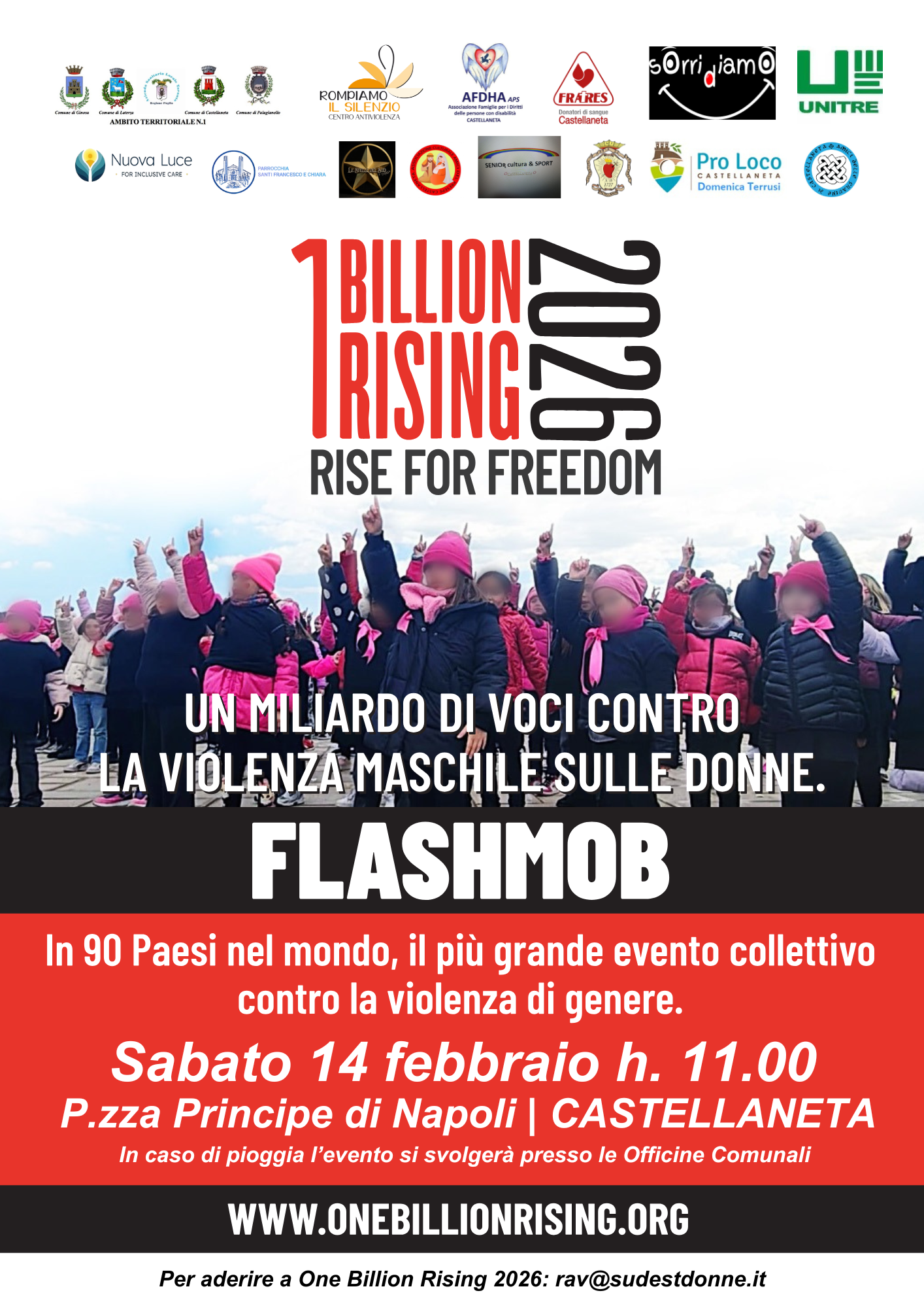 Saranno 13 le associazioni che scenderanno in Piazza Principe di Napoli a Castellaneta la mattina di sabato 14 febbraio alle 11:00 per unirsi al One Billion Rising, il flash mob – a