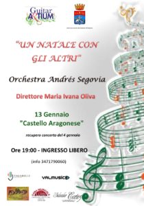 Dopo il rinvio del 4 gennaio u.s. a causa del maltempo, domenica 13 gennaio terzo appuntamento con l’orchestra Andrés Segovia nell’ambito dell’evento dal titolo Un Natale con gli altri organizzato dall’Associazione Guitar Artium per il periodo natalizio.