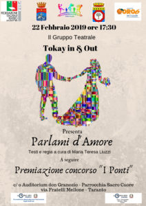 (I Tokay In & Out sono un gruppo composto da attori detenuti e attori della Compagnia Teatrale Massimo Troisi di Taranto. Lo spettacolo si colloca in un progetto ben più ampio che punta a costituire una compagnia di teatro stabile all’interno della Casa Circondariale di Taranto, una compagnia speciale composta da detenuti e da liberi. Il carcere infatti troppo spesso viene visto come luogo di isolamento, luogo delll’oblio, luogo da dimenticare, spesso è collocato in periferia, lontano dallo sguardo dei più. L’obiettivo è invece quello di creare ponti tra il mondo del dentro e il mondo del fuori, perché il carcere e i suoi abitanti non possono rimanere un problema delle sole Istituzioni. Lo spettacolo tratterà il tema della paternità in chiave ironica e sarà intermezzato da momenti musicali offerti dall’Associazione Apulia Musica. Il nome “Tokay In & Out” è stato scelto dal gruppo per il significato di cui è portatore. Il Tokay è un geco e rappresenta il valore dell’adattabilità, un valore necessario all’animale come all’uomo, per poter sopravvivere e andare avanti anche quando sulla nostra strada si pongono ostacoli che possono sembrare invalicabili. Il progetto non sarebbe stato possibile senza la collaborazione preziosa con la Direzione e l’area trattamentale della Casa Circondariale di Taranto, la Polizia Penitenziaria, il Provveditorato dell’Amministrazione Penitenziaria, e il sostegno del Comune di Taranto all’iniziativa, perché è solo insieme che si possono abbattere i muri).