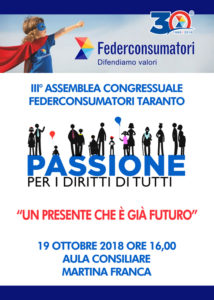 Passione per i diritti di tutti: un presente che è già futuro: questo è il claim della terza Assemblea congressuale di Federconsumatori Taranto che si terrà, alle ore 16.00 di venerdì 19 settembre, presso l’Aula consiliare del Municipio di Martina Franca.