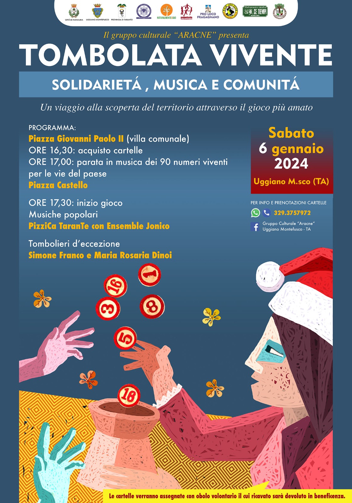 Si terrà sabato 6 gennaio a Uggiano Montefusco, la seconda edizione della TOMBOLATA VIVENTE: solidarietà, musica e comunità, l’originale iniziativa organizzata dal Gruppo Culturale Aracne.