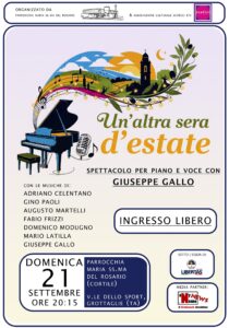 La Parrocchia Maria SS. del Rosario di Grottaglie e l’Associazione Culturale Schécci presentano “Un’altra sera d’estate”, spettacolo per pianoforte e voce di e con Giuseppe Gallo, in programma domenica 21 settembre alle ore 20:15 presso il cortile della Parrocchia Maria SS. del Rosario, in via dello Sport a Grottaglie.