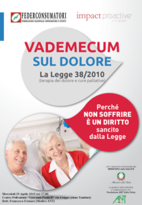 Dall’impegno congiunto dei tre enti è nato così un apposito “Vademecum sul dolore”, esaustivo e di facile consultazione, per informare il più ampio numero possibile di cittadini: per poter riconoscere il dolore e saper valutare i propri sintomi, per conoscere i farmaci, ma soprattutto per sapere a chi rivolgersi, dove sono ubicati i centri di terapia del dolore e i centri di cure palliative, e quali sono i diritti dei cittadini garantiti dalla Legge 38/2010.