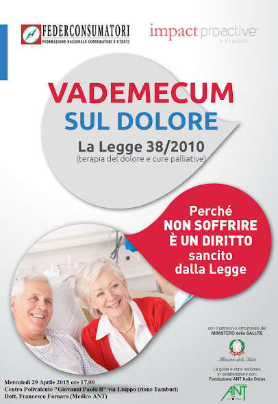 Si terrà mercoledì 29 aprile alle ore 17:00 presso il Centro Polivalente “Giovanni Paolo II” in Via Lisippo al rione Tamburi l’incontro presenziato dal Dott. Francesco Fornaro Medico ANT sulla Legge 38/2010 VADEMECUM SUL DOLORE.