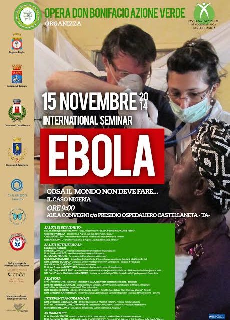 L’Associazione Opera Don Bonifacio Azione Verde promuove con il patrocinio del C.S.V. Taranto, nell’ambito della X Rassegna provinciale del Volontariato e della Solidarietà, un Convegno medico che affronta il tema dell’epidemia del virus Ebola dal titolo Cosa il Mondo non deve fare…Il caso Nigeria. L’intento è quello di affrontare le problematiche legate a questa epidemia con l’obiettivo di definire piani di intervento sanitari per migliorare e rafforzare la prevenzione e il controllo di questo virus e di tutte le malattie infettive trasmissibili più diffuse in Africa.