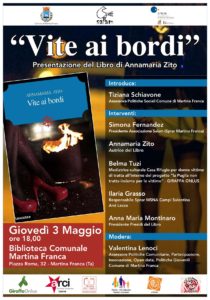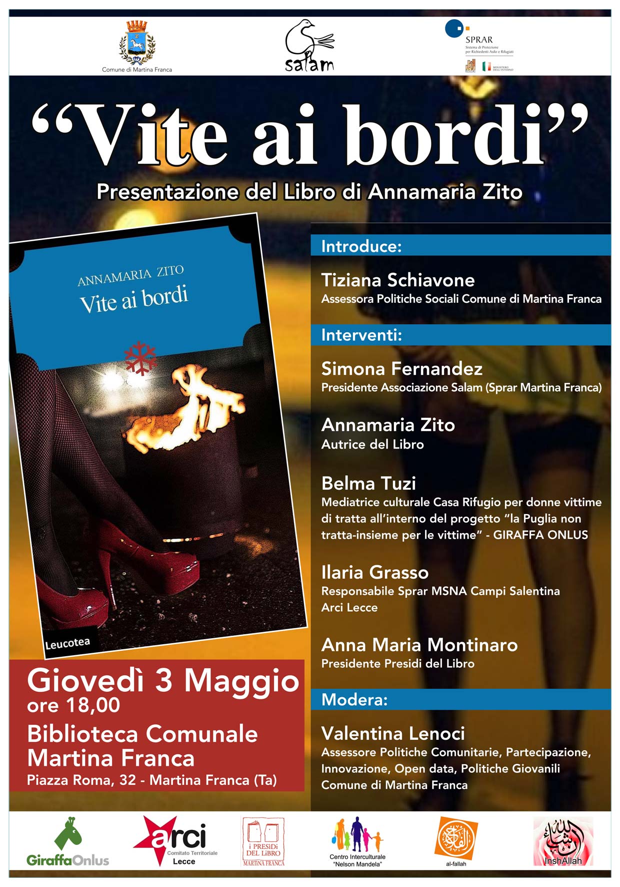 Giovedì 3 maggio lo Sprar di Martina Franca organizza presso la Biblioteca Comunale di Martina Franca alle ore 18:00 la presentazione del romanzo Vite ai Bordi di Annamaria Zito. L’opera è stata ispirata alla storia vera e travagliata di una donna nigeriana vittima di tratta che è stata ospite del centro di seconda accoglienza, gestito dall’Associazione Salam, lo SPRAR di Martina Franca.