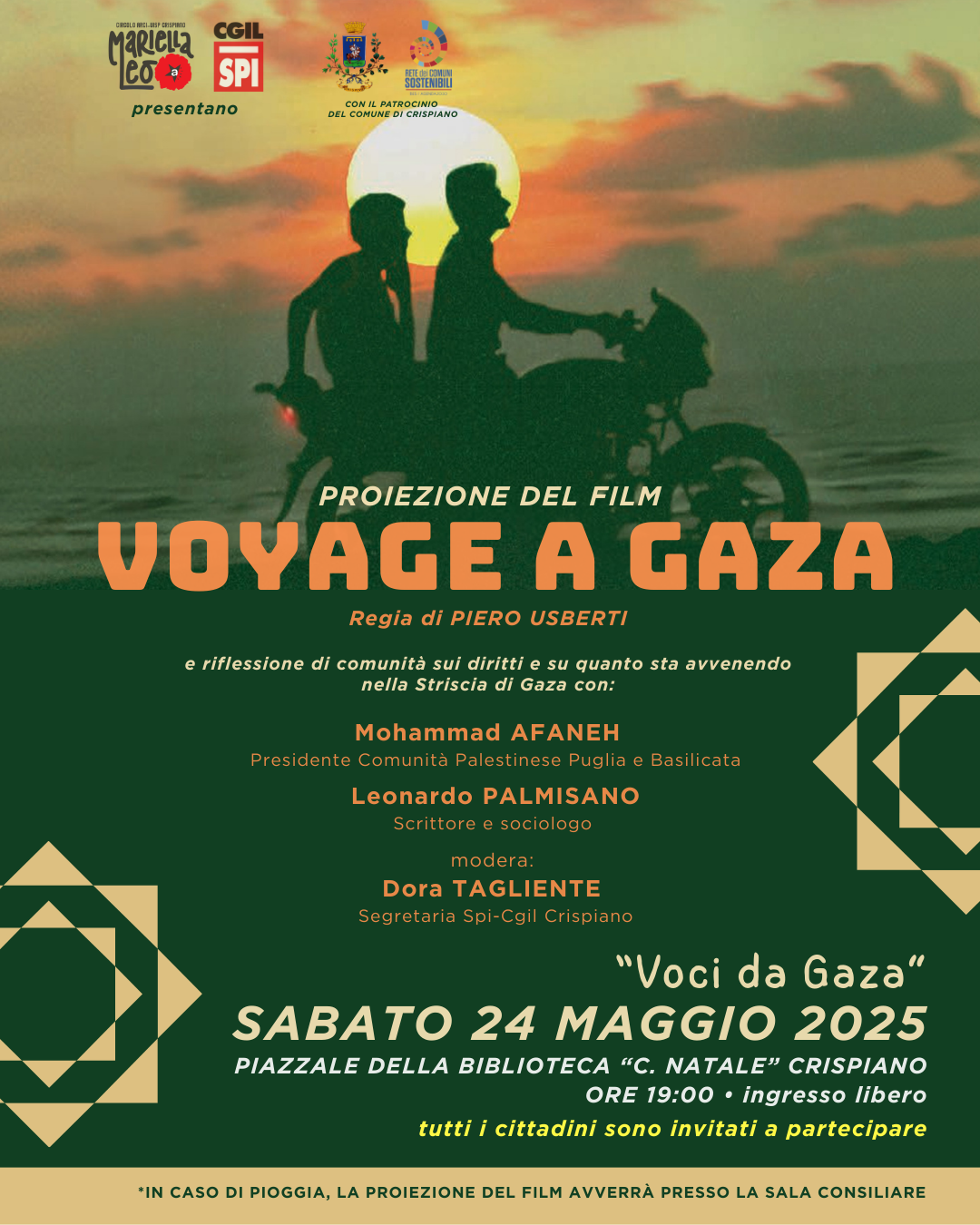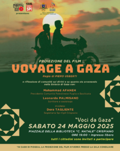 Al centro dell’incontro del 24 maggio, la proiezione di “Voyage à Gaza”, un film-documentario intimo e potente, narrato in prima persona da Piero Usberti, giovane regista italiano che nel 2018 ha trascorso tre mesi a Gaza, ospite del Centro Italiano di Scambio Culturale – VIK , fondato da Meri Calvelli. “A Gaza bisogna arrivare la sera di primavera, chiudersi in camera e ascoltare i suoni che arrivano dalle finestre aperte… È il 2018. Ho 25 anni e sono un viaggiatore straniero. Incontro giovani palestinesi della mia età.” Il film è stato accolto con entusiasmo dalla critica internazionale. Usberti ci conduce tra le strade, i sogni e le ferite di una generazione che chiede solo di poter vivere. È uno sguardo umano, poetico e radicale che invita lo spettatore a vedere , ascoltare , sentire Gaza. “Voci da Gaza” è anche un invito ad attivarsi concretamente. Per questo, sarà promossa la campagna di Arci: HELP GAZA NOW – Dona il tuo 5×1000 CF 97054400581 con la possibilità anche di lasciare un contributo volontario durante l’evento. Un piccolo gesto che può sostenere progetti umanitari e iniziative di solidarietà nei territori colpiti. In un momento in cui tutto sembra crollare, la solidarietà è una forma di resistenza. In un tempo in cui la cultura viene spesso ridotta a intrattenimento, questa serata è invece un esercizio collettivo di coscienza. Una chiamata alla responsabilità, alla consapevolezza, alla vicinanza. Perché, come ci ricordano le parole dell’appello del 9 maggio: “Per ripudiare l’Europa delle guerre antiche e contemporanee, per proteggere l’Europa di pace nata da un conflitto mondiale, esiste un solo modo: proteggere le regole, il diritto, e la giustizia internazionale. E soprattutto guardarci negli occhi, e guardarci come la sola cosa che siamo: umani.” Crispiano si unisce a una rete globale di cittadinanza attiva. Perché la strage, perché il genocidio, abbiano fine. Ora.