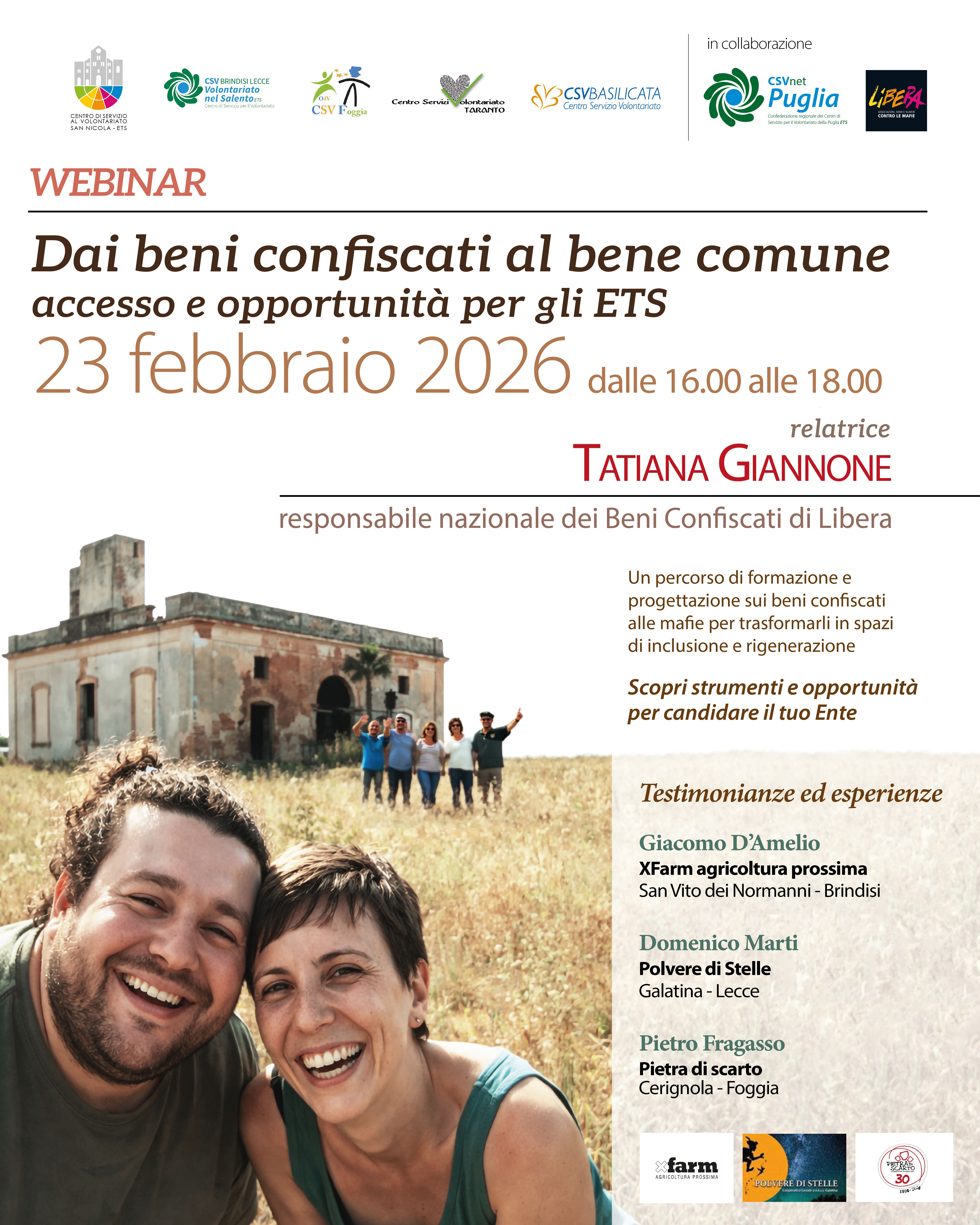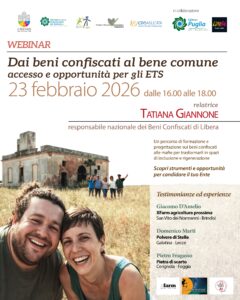 Lunedì 23 Febbraio 2026 dalle 16,00 alle 18,00 (online su piattaforma Zoom) i Centri di servizio al volontariato della Puglia e della Basilicata, in collaborazione con Libera. Associazioni, nomi e numeri contro le mafie, organizzano il webinar “Dai beni confiscati al bene comune: accesso e opportunità per gli ETS” con Tatiana Giannone, responsabile nazionale beni confiscati “Libera. Associazioni, nomi e numeri contro le mafie”.