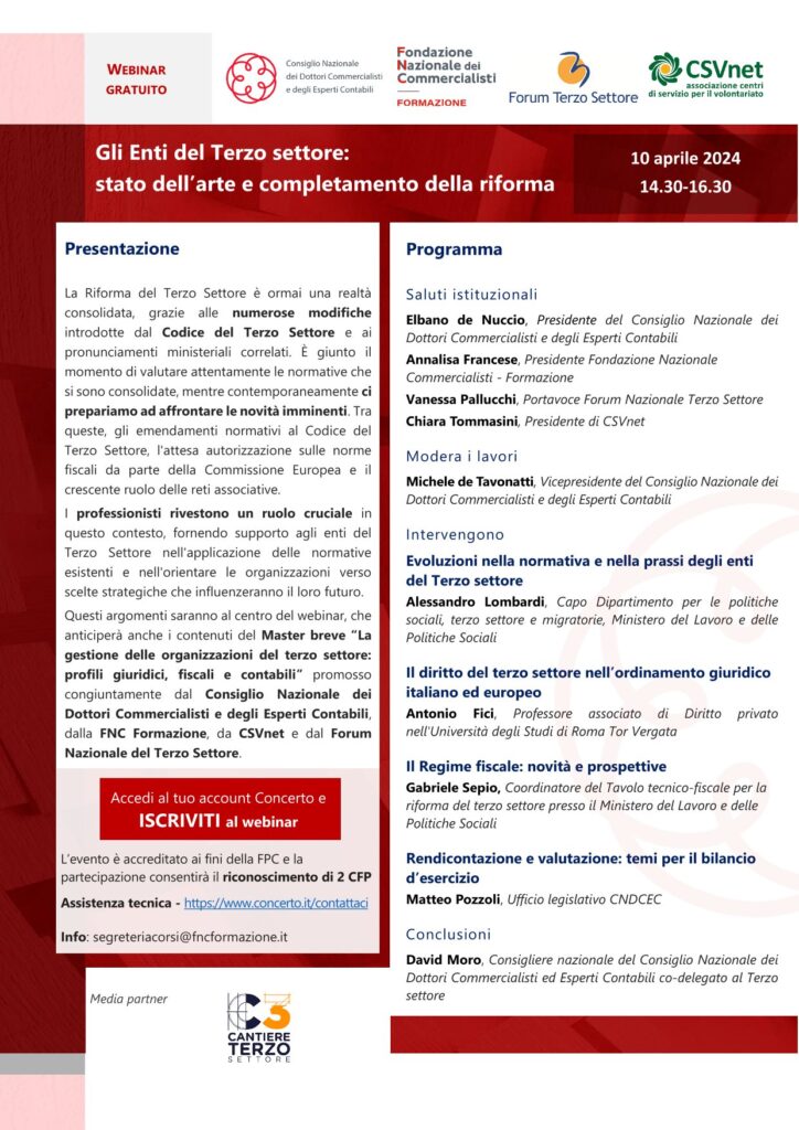 Il Consiglio Nazionale dei Dottori Commercialisti e degli Esperti Contabili, CSVnet, Forum Nazionale del Terzo settore e la Fondazione Nazionale Formazione dei Commercialisti organizzano per mercoledì 10 aprile dalle 14.30 alle 16.30 un webinar gratuito di formazione, rivolto ai dottori commercialisti, sul tema Gli enti del Terzo settore: stato dell’arte e completamento della riforma.